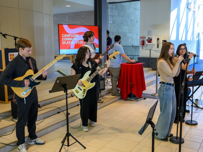 Dans le hall du pavillon Ferdinand‑Vandry, les facultés de médecine, de pharmacie et des sciences infirmières ont uni leurs couleurs pour créer un événement rassembleur regroupant des membres du corps professoral, de la direction, du personnel et de la communauté étudiante. L’ambiance était portée par la prestation du MedBand, le groupe de musique étudiant de la Faculté de médecine.